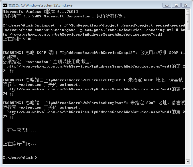 wsimport -s D:\SvnRepository\Project-Reward\project-reward\reward-server\frame-zone\src\main\java -p com.gmcc.frame.webservice -encoding utf-8 http://www.webxml.com.cn/WebServices/IpAddressSearchWebService.asmx?wsdl
